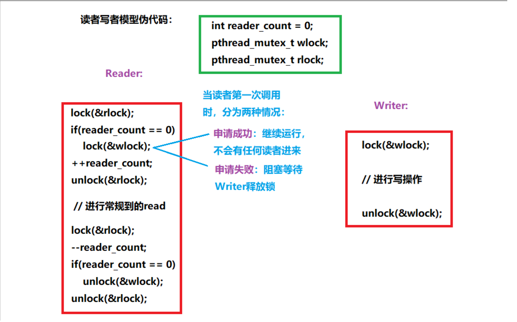 读者申请读锁,进入临界区;判断是否为“第一个进入的读者”:若是,需申请写锁——因为此时需确保没有写者正在执行写操作(保障读写互斥);若不是,直接进入读操作(读者间无互斥);