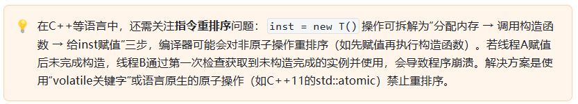 inst != nullptr,直接退出临界区,避免重复创建。3️⃣额外注意事项