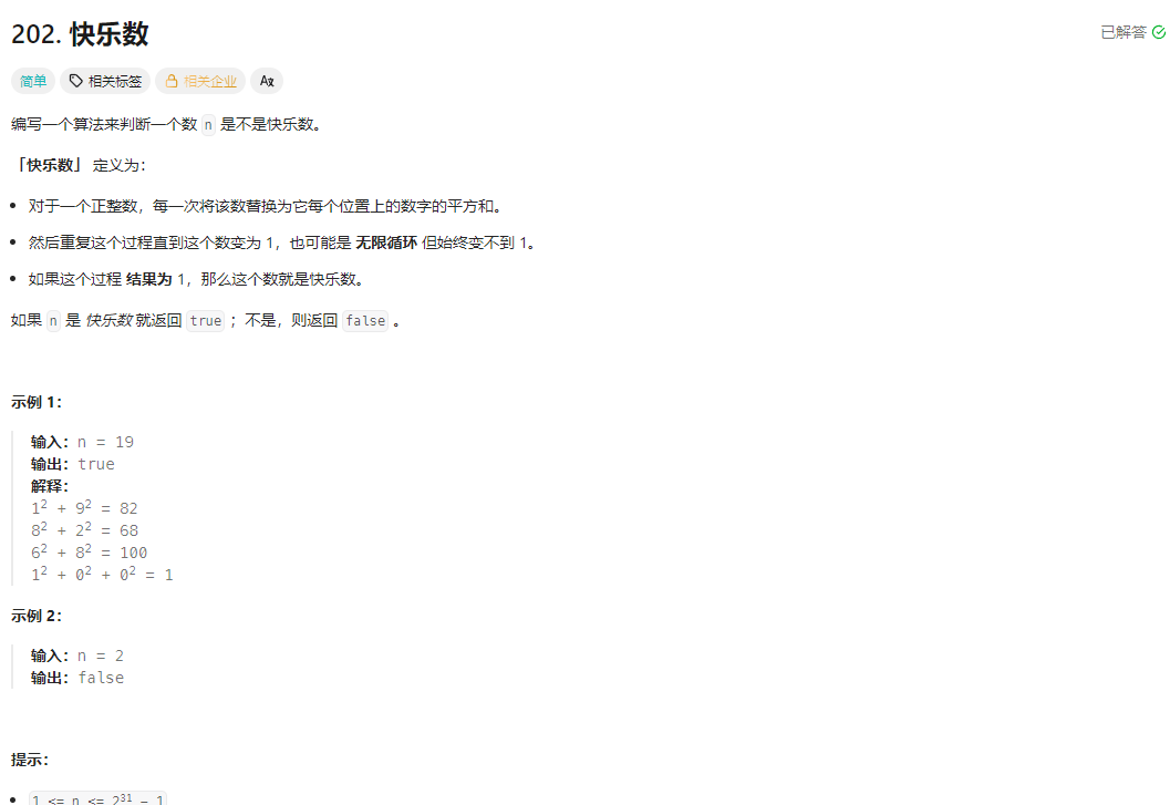 - 快乐数判断逻辑:核心是通过计算各位平方和迭代,直到结果为 1(快乐数)或出现重复数字(进入循环,非快乐数)。