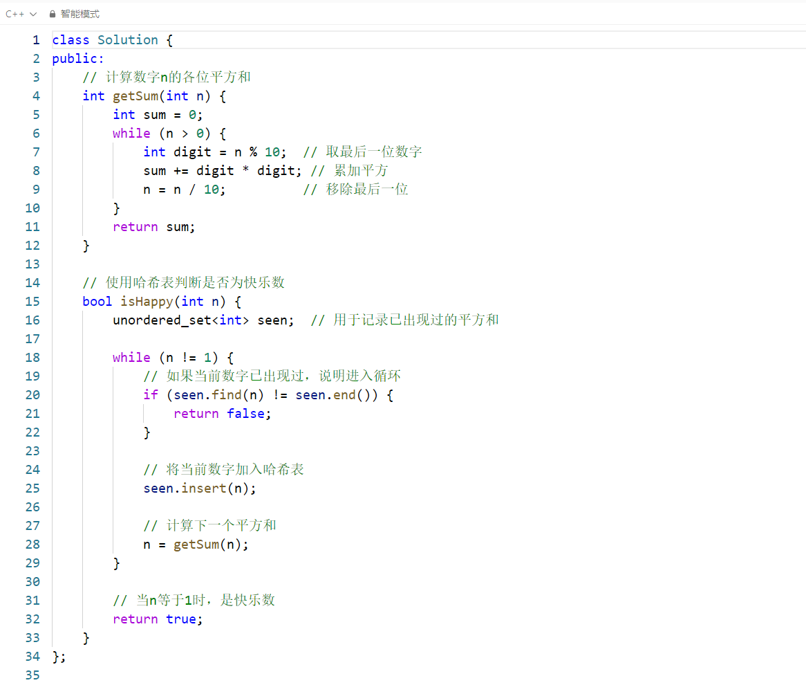这段代码实现了判断一个整数是否为快乐数 (Happy Number) 的功能。快乐数的定义是:从任意正整数开始,将其各位数字的平方和替换原数,重复此过程,最终如果结果收敛到 1,则为快乐数;如果进入不包含 1 的循环,则不是快乐数。