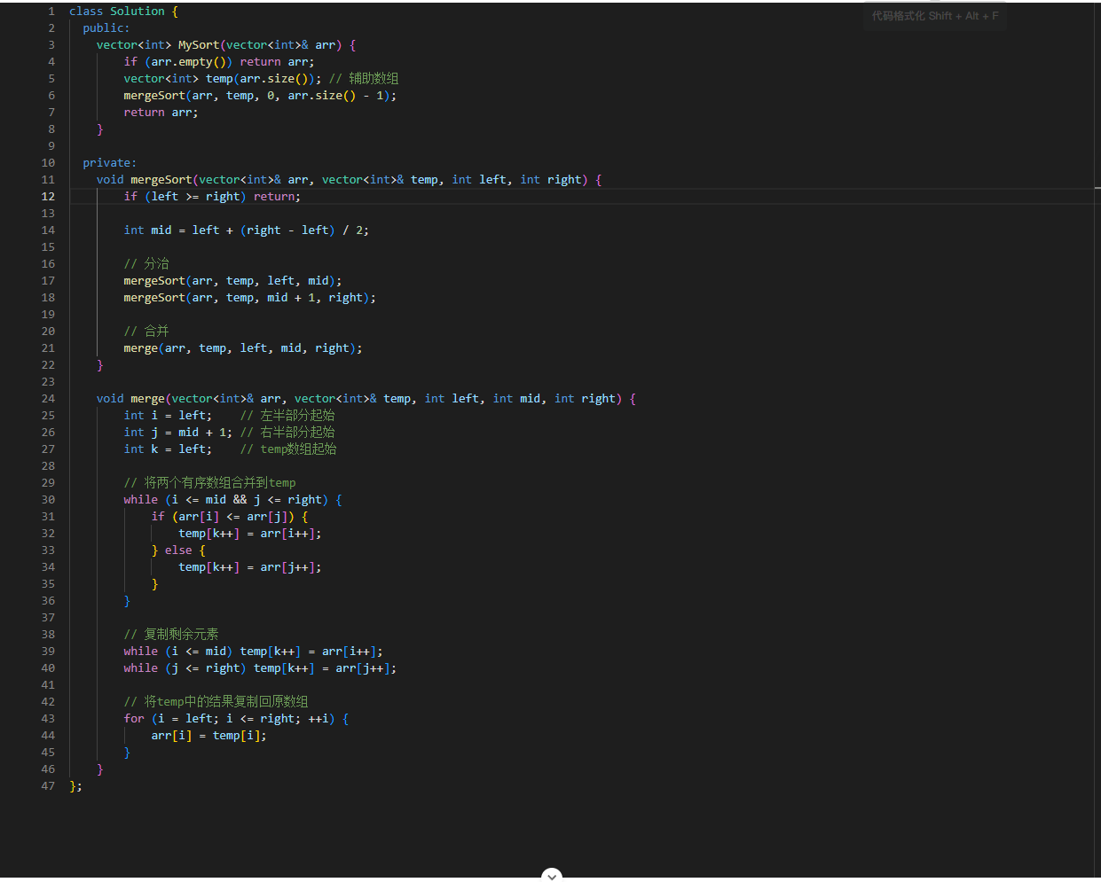 这段代码实现了一个归并排序 (Merge Sort) 算法,用于对整数数组进行升序排序。归并排序是一种基于分治思想的高效排序算法,时间复杂度为 O (n log n)。