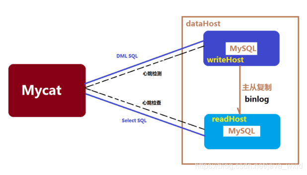 dataHost标签在mycat逻辑库中也是作为最底层的标签存在,直接定义了具体的数据库实例、读写分离配置和心跳语句。
