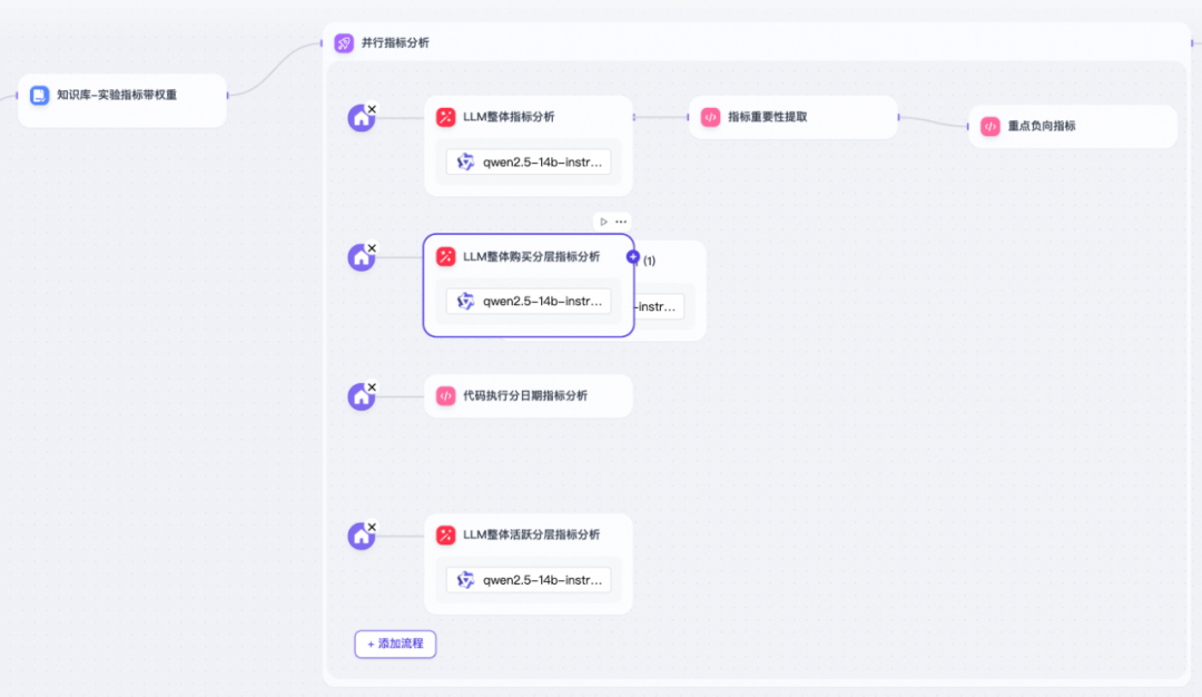 我们在做实验分析的项目中,分析报告会涵盖下面几项比较重要的维度,比如下图所示整体实验结论、分指标结论、非重点指标以及均匀性检测,同时还有最后比较关键的建议或洞察,在这里如果基于实验的相关前置统计数据,一股脑的给到大模型,让它去做几个维度的结论生成,效果会很差,因为我们针对每个维度都会有一些 prompt,在这样长序的输入下,大模型非常容易丢失一些 context,返回的结果可能只能覆盖部分内容,同时在整体返回时长上也比较久,在这里我们做了任务的拆分,每个维度一个 task,然后做了并行的调用编排。