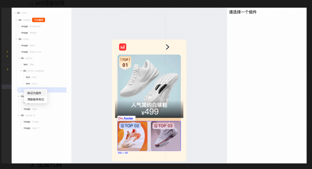 该案例是在 B 侧后台页面生成的链路中,虽然我们看到后台的页面是一个以表格或图表为主,看似元素比较固定和简易,但是如果整张视觉稿扔给 LLM,最终结果也是非常 “感人” 的,本质上的原因有两个:1. 和案例 1 一样,整个页面的生成任务,还是偏大,需要拆分;2. 这里的拆分不全是基于视觉分块的切分,是需要结合背后组件能够解决的问题粒度进行合理拆分,才能保证最终生成的效果有一定保障。