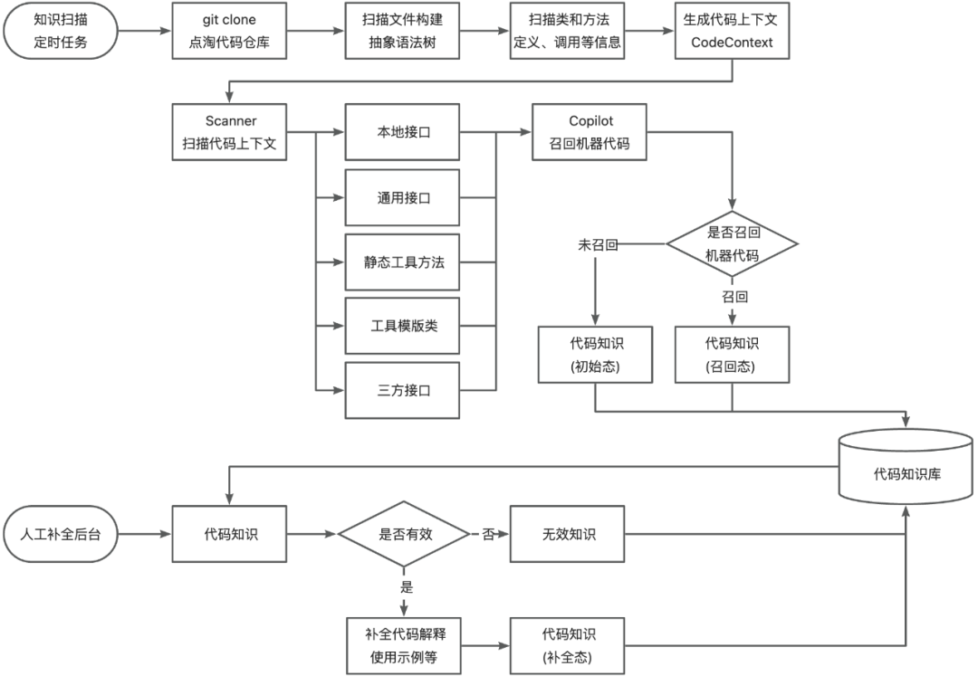 这个案例取自服务端代码生成项目上,其实内部的 aone copilot 在通用任务上做的非常好用了,官方统计的采纳率也达到了 25%,是个非常不错的 code copilot 的产品,但是对于业务侧的开发来说,这类 copilot 生成的代码,属于基础实现代码,因为不太能很好的结合当前业务下沉淀的服务、方法来做代码生成,因此我们需要把这部分所谓的服务、方法、工具等接口信息和使用 case 给到 LLM,它才能结合这样的 context 去做最终代码的生成;下面两幅图描述的是我们对于知识的扫描和知识的录入设计的链路。