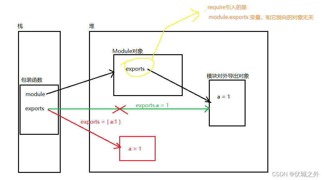 这里需要注意的是:模块require引入的最终是其他模块的module.exports对象。但是我们在模块内既可以使用module.exports导出数据,也可以使用exports导出数据,那么二者使用是否有差别呢?