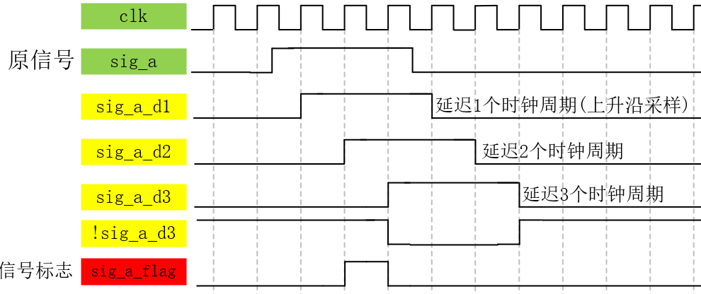 sig_a变为1):sig_a_d1 = sig_a = 1sig_a_d2 = sig_a_d1 = 0(上一周期的值)sig_a_d3 = sig_a_d2 = 0(上一周期的值)