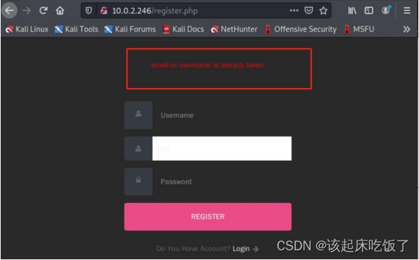 访问 login.php 页面,是个登录页面,由于前面提示说不需要浪费时间爆破, 所以先不爆破,去注册页面注册个账号然后登录进来,注册的时候使用 admin 注册,提示说已存在,可得知 admin 账户存在