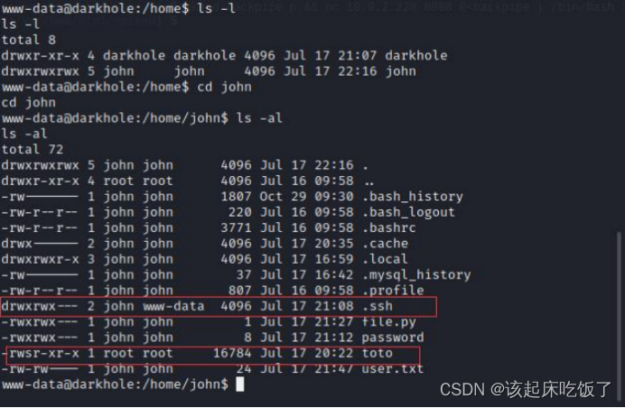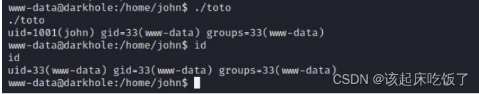 在家目录下面发现了一个 toto 文件,执行发现和 id 一样的功能(当 s 权限在文 件所有者 x 权限位上时,例如:-rwsr-xr-x,此时称为 Set UID,简称为 SUID
