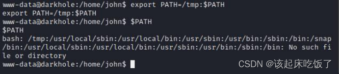 创建名为 id 的文件,将 bash 文件的位置写入 id 当中,然后使用 export 修改环 境变量,优先加载 tmp 下的 id 文件,echo 输出 path 查看是否修改成功