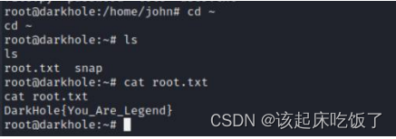 查看 id 发现提权成功 拿到第二面 flag DarkHole{You_Are_Legend}
