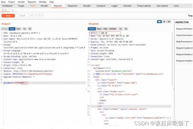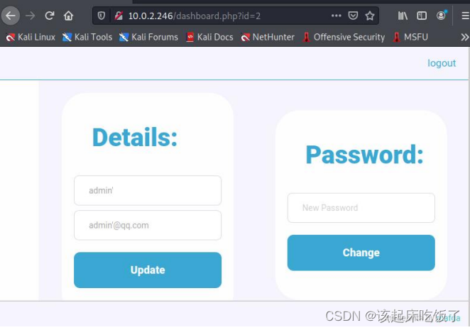 有个 id 号,想水平越权,发现不行,发现有个修改密码功能,尝试垂直越权修 改 admin 的密码,抓包的时候 id=2,猜测 admin 为 id=1