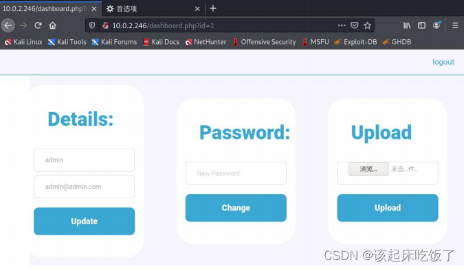 修改成功,尝试登录,发现成功用 admin/123456 登录,有一个文件上传功能