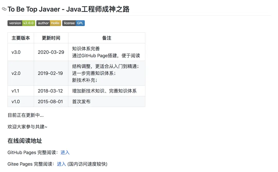 这一版本不仅在v2.0的基础上,新增20%左右的知识点,还调整了调整部分知识的顺序及结构,方便阅读和理解。不过,**最最重要的是作者将该项目的内容整理成书,并开源出来了,并且通过GitHub Page搭建,便于阅读。**需要学习、或者参与共建的朋友,可以学习一下,笔者试了一下啊,体验非常好。