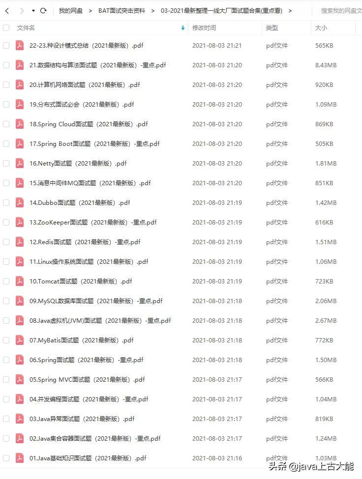 Java面试宝典共266页覆盖了基础、JVM、多线程、高并发、spring、mybatis、MySQL、spring cloud、dubbo、Nginx、MQ、数据结构与算法、Linux、Zookeeper、Redis、分布式、网络、设计模式的经典面试题及答案