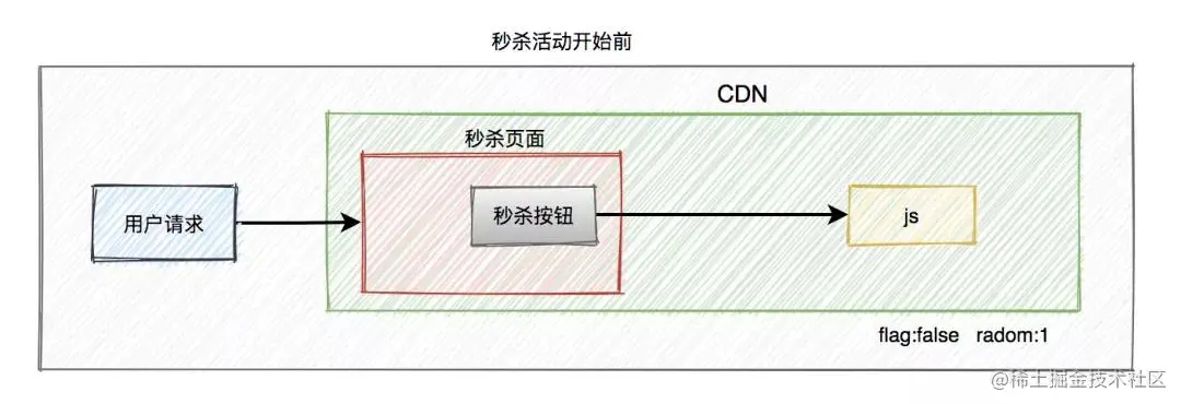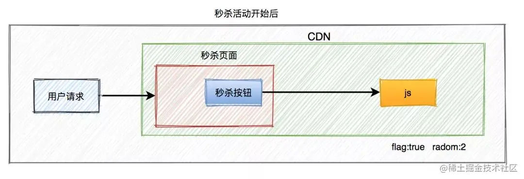 当秒杀开始的时候系统会生成一个新的js文件,此时标志为true,并且随机参数生成一个新值,然后同步给CDN。由于有了这个随机参数,CDN不会缓存数据,每次都能从CDN中获取最新的js代码。