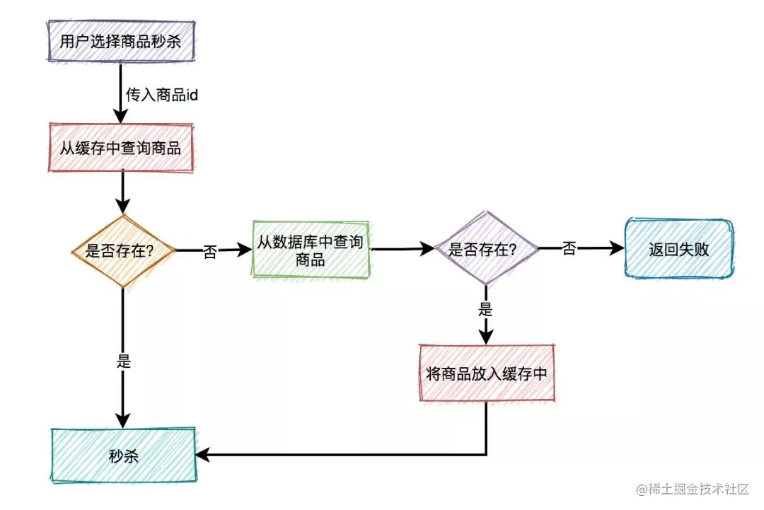 根据商品id,先从缓存中查询商品,如果商品存在,则参与秒杀。如果不存在,则需要从数据库中查询商品,如果存在,则将商品信息放入缓存,然后参与秒杀。如果商品不存在,则直接提示失败。