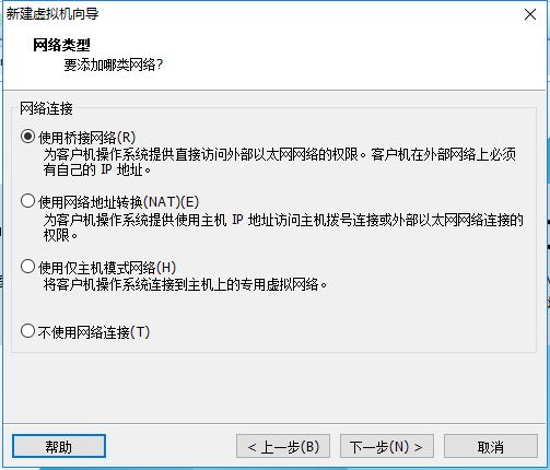 8.网络连接类型的选择,网络连接类型一共有桥接、NAT、仅主机和不联网四种。