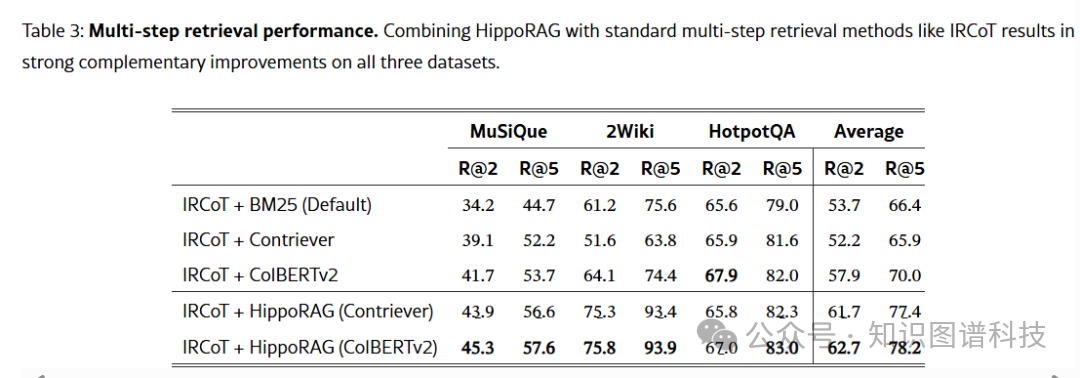 更令人振奋的是,HippoRAG与标准多步检索方法IRCoT结合使用时展现出强大的互补性:
