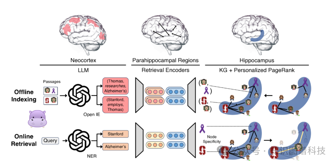 受此启发,研究团队开发了HippoRAG,一个模拟人类记忆机制的RAG框架 。该系统包含三个核心组件,分别对应人类记忆系统的三个部分: