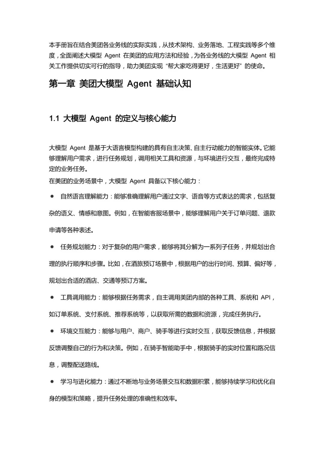 本手册旨在结合美团各业务线的实际实践,从技术架构、业务落地、工程实践等多个维度,全面阐述大模型Agent在美团的应用方法和经验,为各业务线的大模型Agent相关工作提供切实可行的指导,助力美团实现 “帮大家吃得更好,生活更好” 的使命。