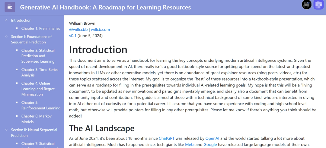 《GenAI Handbook》——GenAI/LLM 学习资源索引,汇聚了自 ChatGPT 发布以来的 近2年时间里,GenAI/LLM 领域的发展和系统知识指南。分为 9 个部分,参考了顶尖的 Blog、论文、Youtube 视频和在线课程,为读者提供了一个清晰了解 GenAI 发展的脉络。