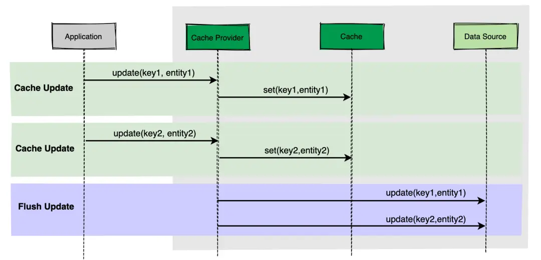 如上图,应用程序更新两个数据,Cache Provider 会立即写入缓存中,但是隔一段时间才会批量写入数据库中。