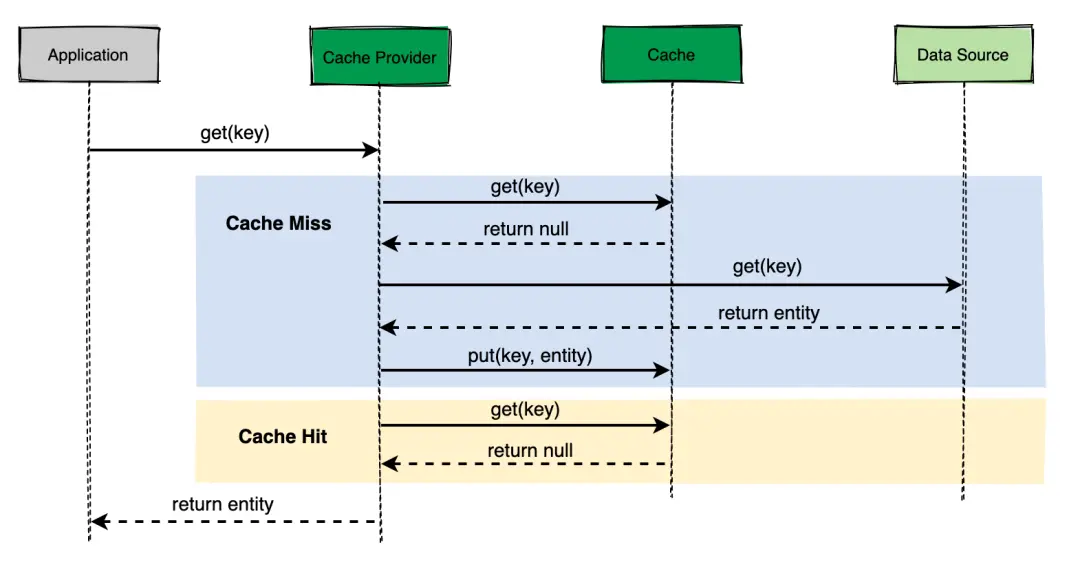 - 在 Read-Through 中,此逻辑通常是由独立的缓存提供程序(Cache Provider)支持。