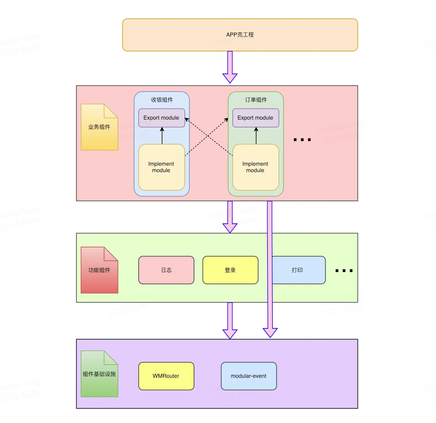 - 业务组件层:根据不同的业务构成独立的业务组件,其中每个业务组件包含一个Export Module和Implement Module。
