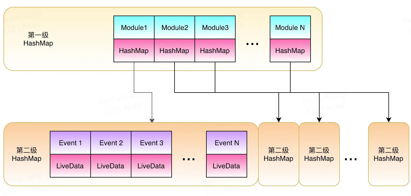 其实这个问题还是比较好解决的,实现的方式就是采用两级HashMap的方式解决。第一级HashMap的构建以ModuleName作为Key,第二级HashMap作为Value;第二级HashMap以消息名称EventName作为Key,LiveData作为Value。查找的时候先用组件名称ModuleName在第一级HashMap中查找,如果找到则用消息名EventName在第二级HashName中查找。整个结构如下图所示: