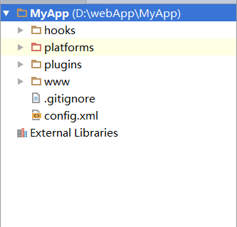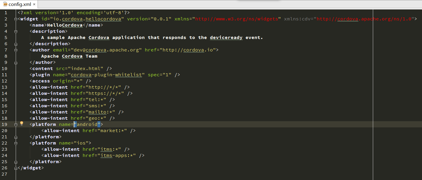 加上 Android 平台,这会下载一个 Android 项目的框架,并把版本信息保存到 config.xml 。你可以去 platforms/android 目录下查看它。