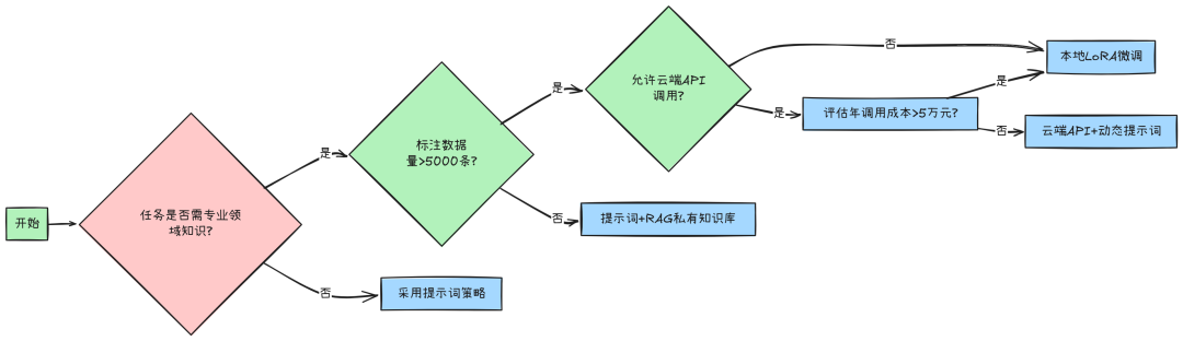 - 实时性要求:端到端延迟<100ms必须本地微调;允许>500ms可考虑提示词API