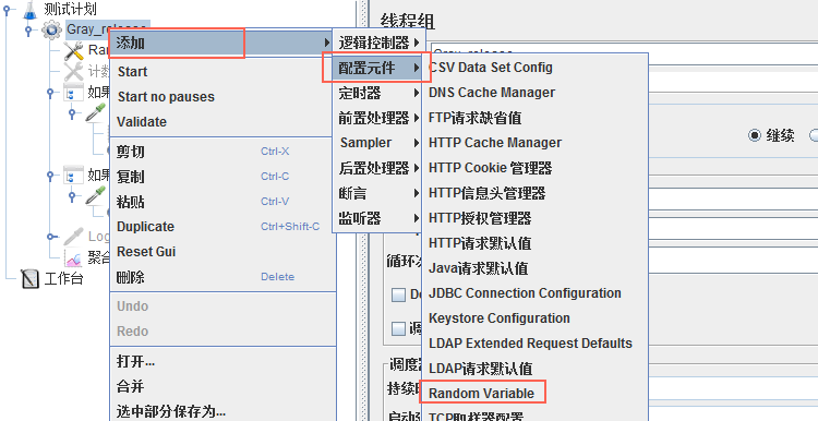 在测试计划下,我们右键“添加”——配置原件——Random Variable