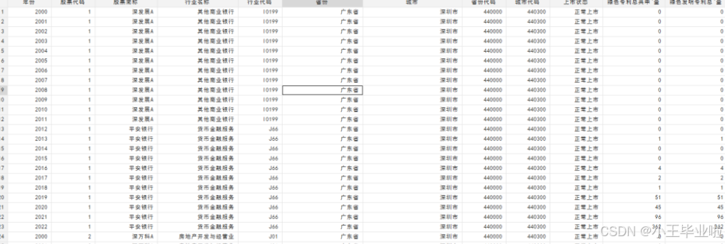 年份、 股票代码、 股票简称、 行业名称、 行业代码、 省份、 城市、 省份代码、 城市代码 上市状态、 绿色专利总共申请总量 、绿色发明专利总共申请数量、绿色实用新型专利总共申请数量、数字化转型程度A、总资产元、企业年龄、资产负债率、营业收入增长率、第一大股东持股比率、独立董事占比、两职合一