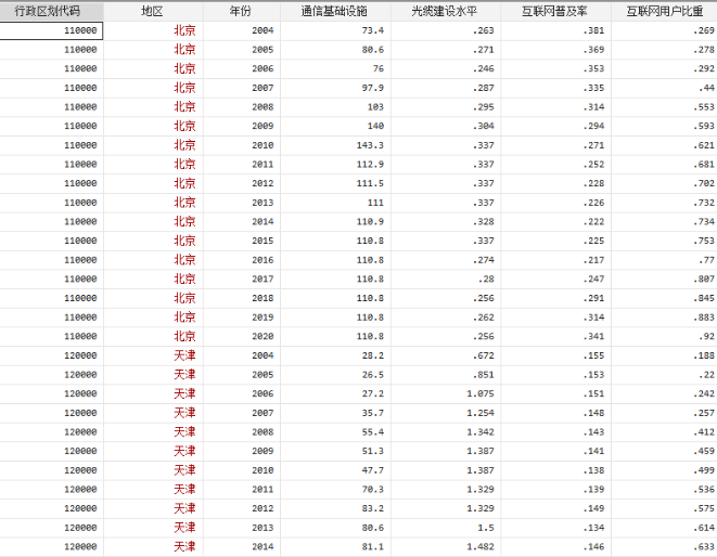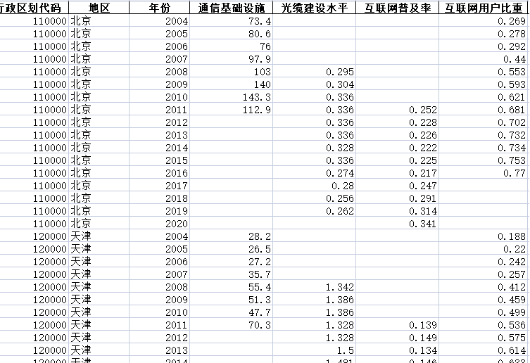 主要指标有计算机服务和软件业固定资产投资,长途光缆线路长度,城区面积,互联网宽带接入用户,互联网上网人数,年末常住人口,其中通信基础设施信息传输指标参照计算机服务和软件业固定资产投资,科技支出占比指标参照地方财政科学技术支出 / 地方财政一般预算支出,光缆建设水平指标参照长途光缆线路长度 / 城区面积*10000,互联网普及率指标参照互联网宽带接入用户 / 年末常住人口,互联网用户比重参照互联网上网人数 / 年末常住人口;