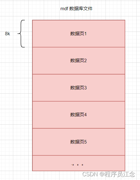 一般来说,对大块资源或者数据进行高效管理都会按照一定粒度来划分的,比如说 Windows 对内存的管理就是按照 内存页 (4k) 来进行划分,言外之意就是 SQLSERVER 对 mdf 的管理也是按照 数据页 (8k) 来划分的,画个图大概就是这样的。