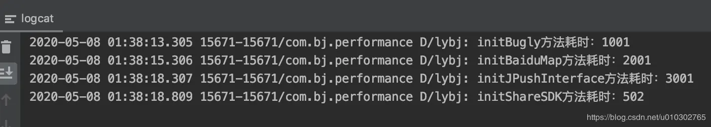 Log.d(“lybj”, methodName + “方法耗时:”+ (System.currentTimeMillis() - startTime));