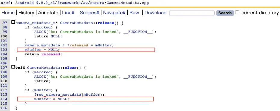 既然工具能拦截到这么多的未释放的内存分配,一定是因为这些内存的释放逻辑出问题导致的,我们需要优先调查清楚 CameraMetadata.mBuffer 的释放逻辑。通过分析 CameraMetadata.cpp 的源码可知,CameraMetadata::release()并未释放 mBuffer 所指向的内存,而是把 mBuffer 所指向的内存赋值给了另一个 CameraMetadata 对象;CameraMetadata::clear()是真释放,而 clear 的调用有两个场景:一个是在 camera_metadata_t 复用时,另一个是 CameraMetadata 对象析构时。