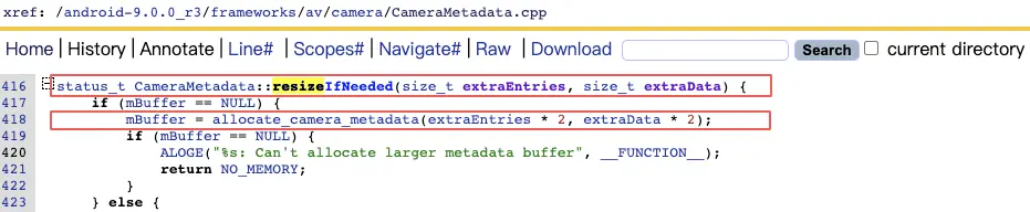 由于 native 内存分配的频率过高,获取 Java 层堆栈又比较耗时,在拦截 native 内存分配时并不适合直接频繁抓取 Java 堆栈。Native 内存不同于 Java 内存,单从拦截到的数据很难直观给出结论。通常对于内存等资源不合理使用导致的资源不足而引发的问题都很难归因,从拦截到的数据来看,CameraMetaData 所引用的内存最大,嫌疑也最大,基于此决定剖析一下这个问题