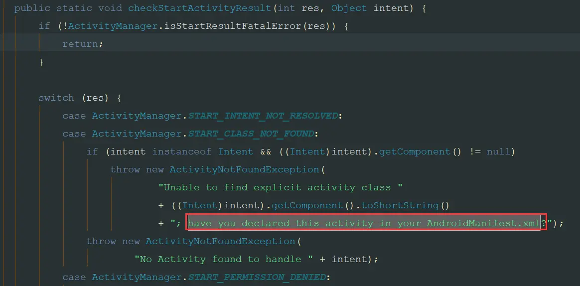 ActivityManager.getService()(即AMS),它的作用是 启动一个Activity并且返回result,然后checkStartActivityResult(result, intent);这句话,对当前的跳转意图intent进行检测;