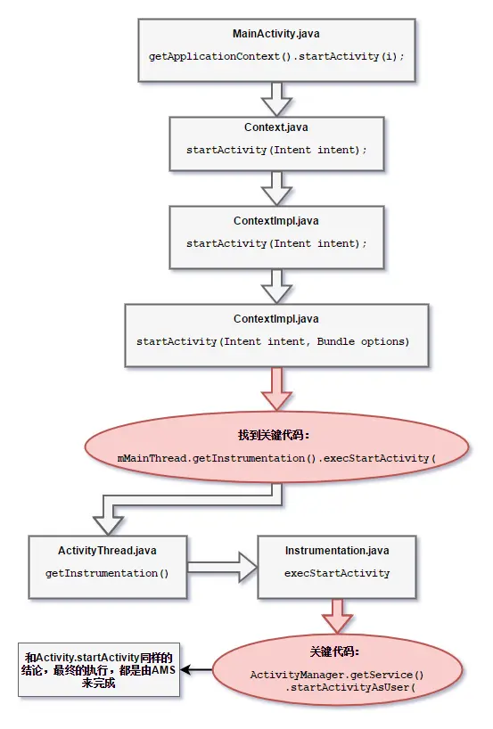 回顾之前的两张代码索引结论图,会发现,两种启动Activity的方式,最终都被执行到了 AMS内部,