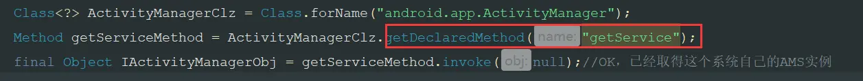 final Object IActivityManagerObj = getServiceMethod.invoke(null);//OK,已经取得这个系统自己的AMS实例