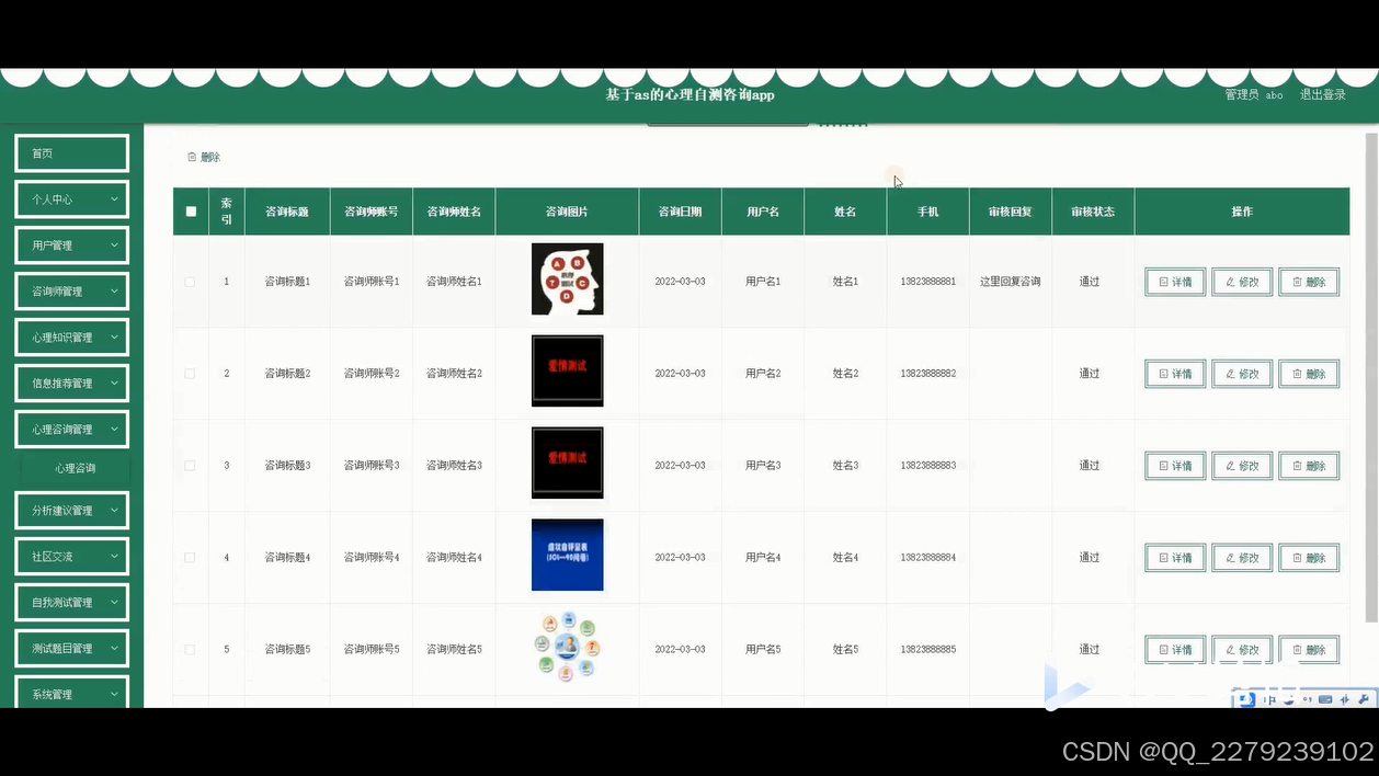 系统提供多种心理测评工具,帮助用户了解自己的心理状态。用户可以通过系统预约心理咨询师,进行在线咨询。心理咨询师可以根据用户的情况提供专业的建议和治疗方案。同时,系统还提供丰富的心理知识,包括心理健康常识、心理调节方法等。这个心理咨询心理测评系统有助于提高用户的心理健康水平,促进社会的和谐发展