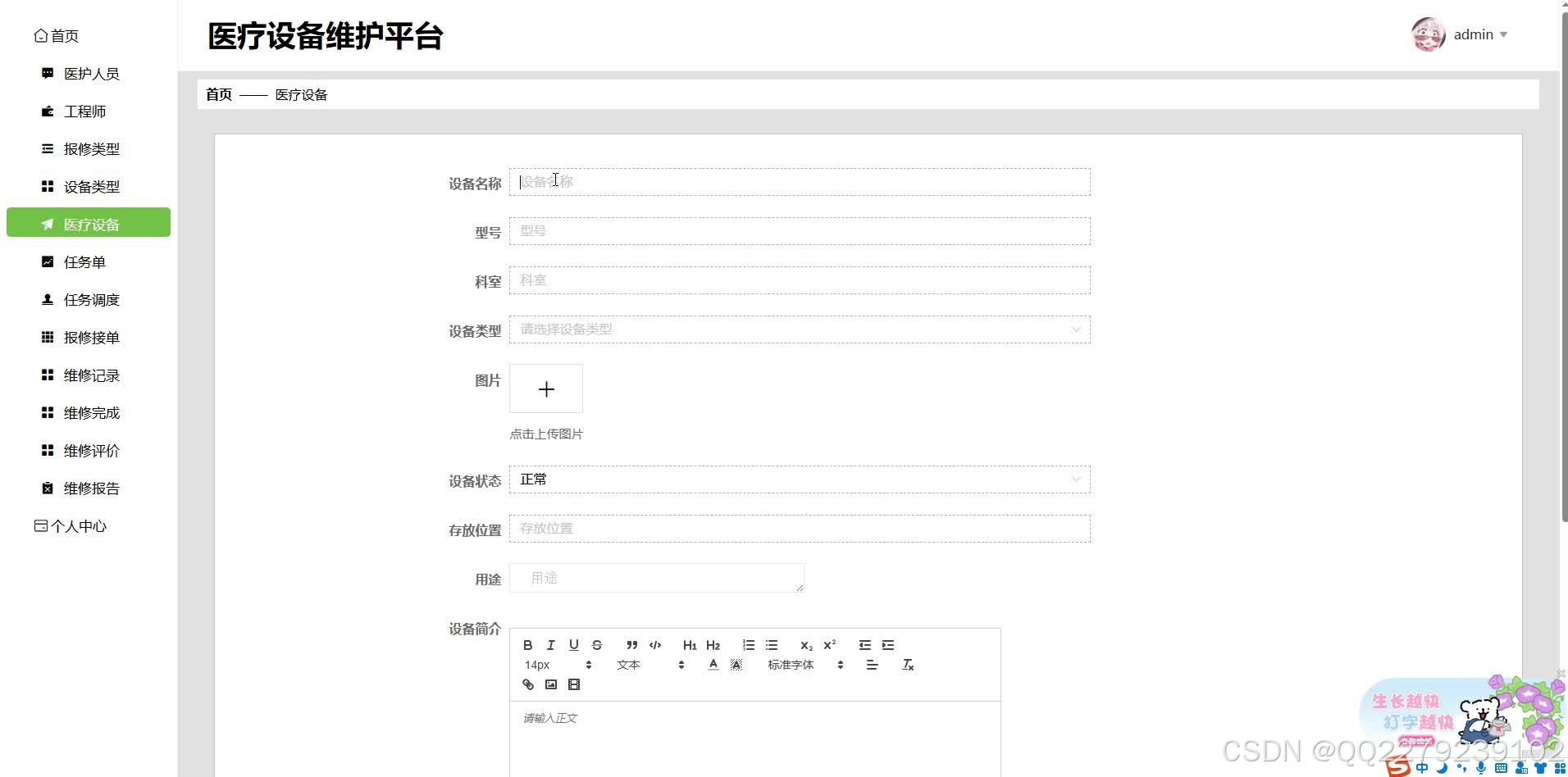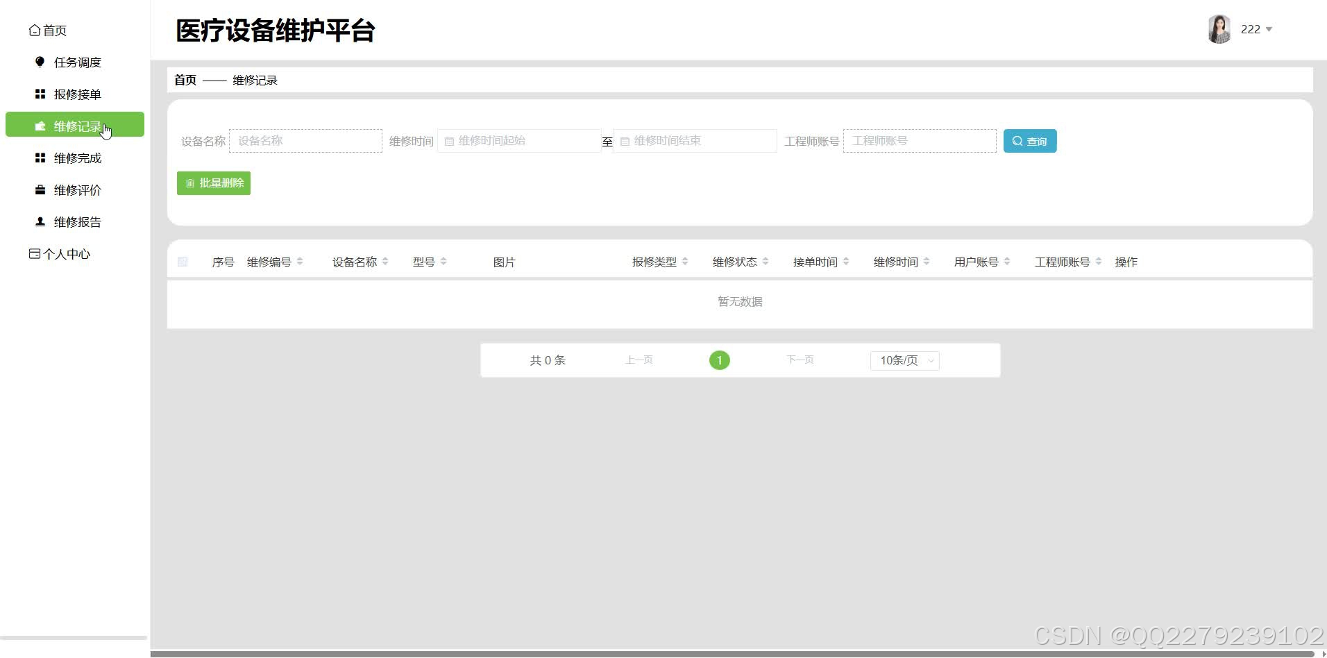 医疗设备的稳定运行是医疗服务质量的重要保障,基于Java SpringBoot框架构建的设备维护平台,可破解传统管理中台账混乱、维护滞后等难题。系统采用SpringBoot+MyBatis-Plus+Vue技术栈,以分层架构实现业务逻辑与数据访问的解耦,具备高可扩展性。