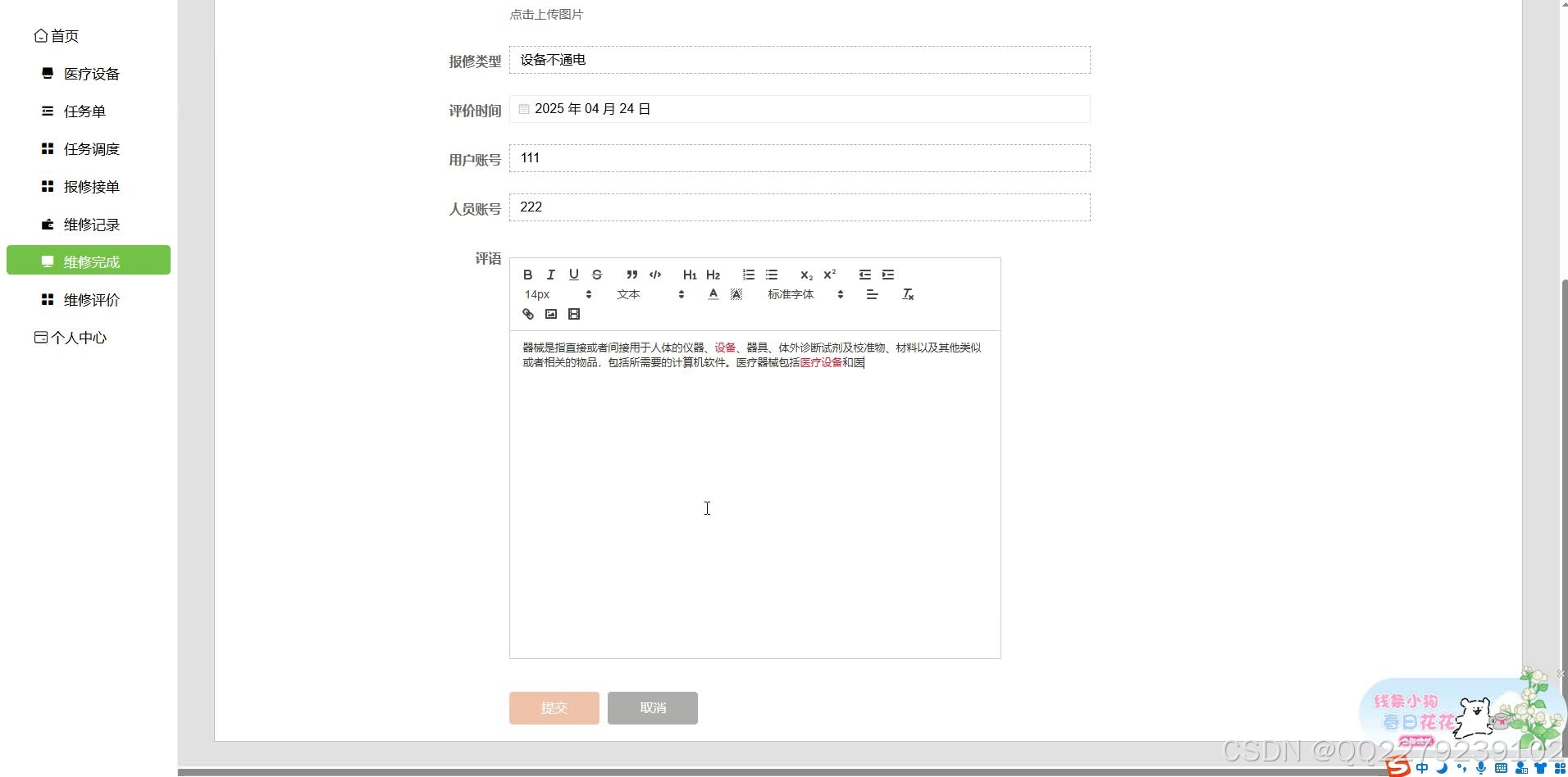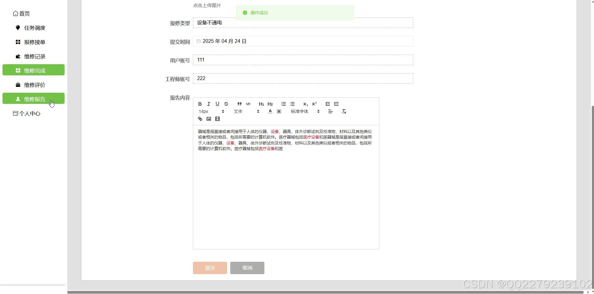 系统通过Spring Security实现多角色权限管控,Redis缓存关键数据提升响应效率。应用实践表明,该平台实现了设备维护的规范化与智能化,缩短故障处理周期,降低运维成本,为医疗设备安全运行提供坚实技术支撑,助力医疗管理提质增效。