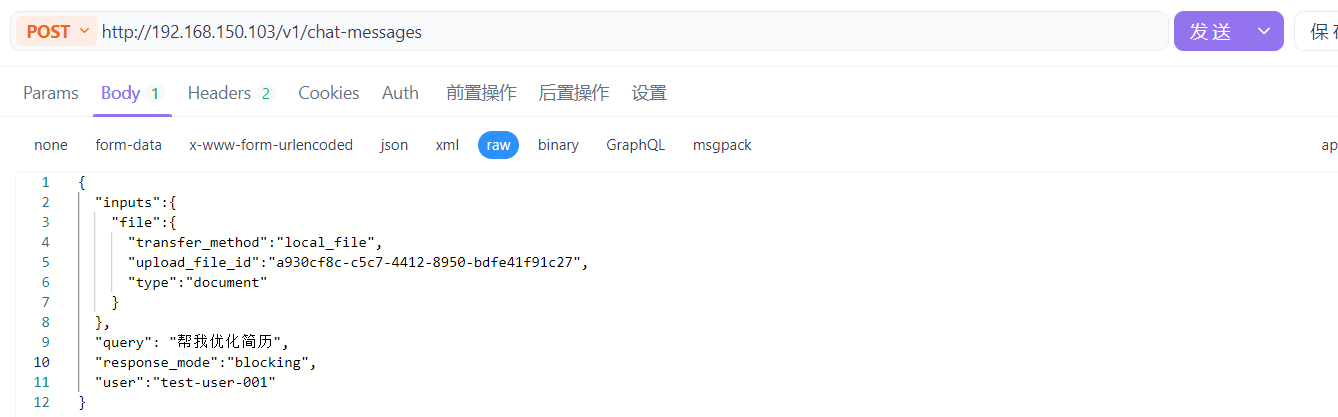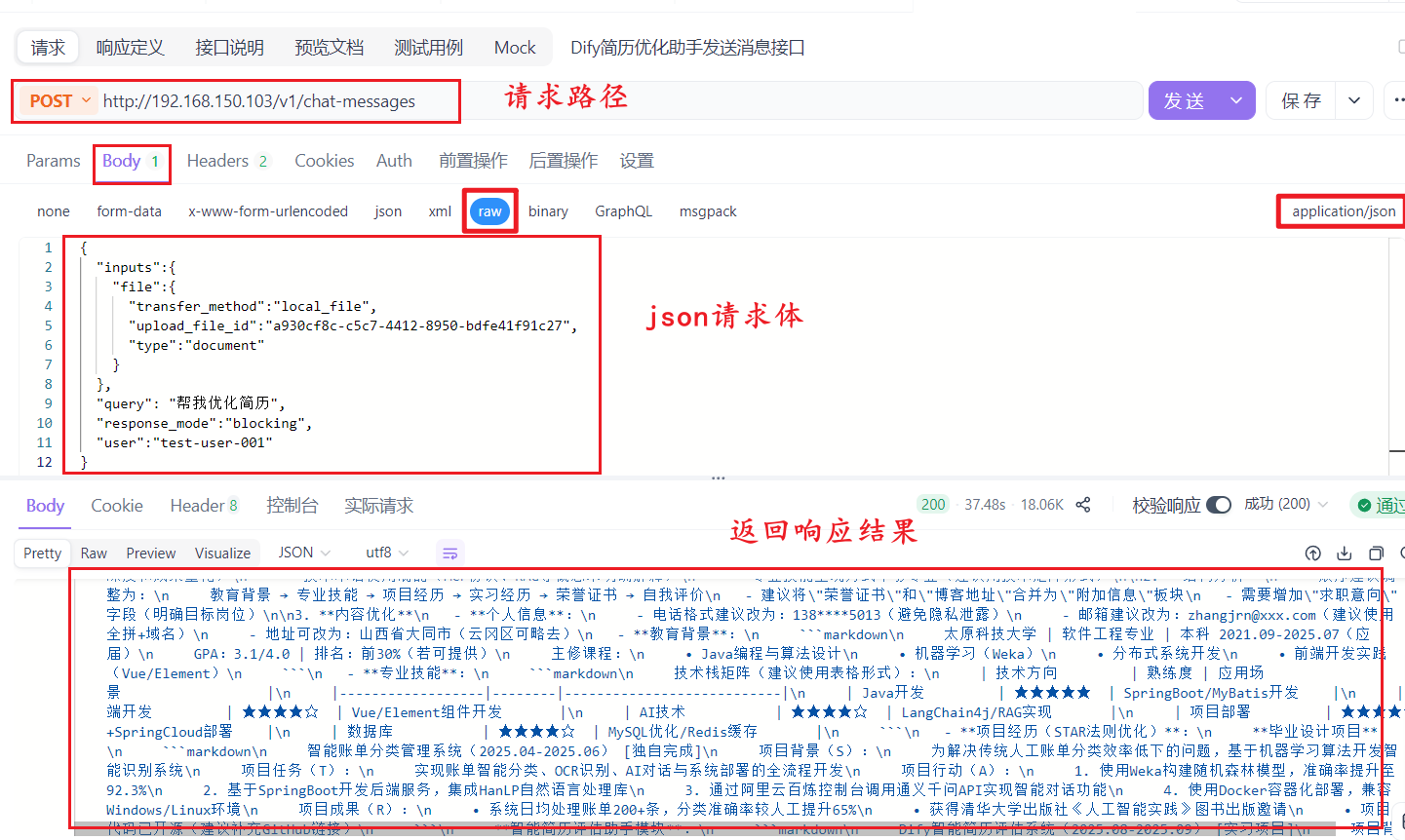 upload_file_id、query: 帮我优化简历、user: test-user-001; - Dify 处理: