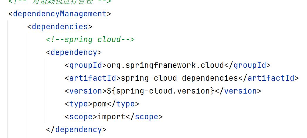 Ctrl+B进入Spring-cloud-dependencies中可以看到里面有SpringCloud中的组件以及版本控制,几乎所有的SpringCloud的组件这里面都引入了。所以我们在引入了Spring-cloud-dependencies以后,我们在开发过程中就不需要指定组件的版本了,以后要用到那个版本,直接把组件引入过来,不用管版本。