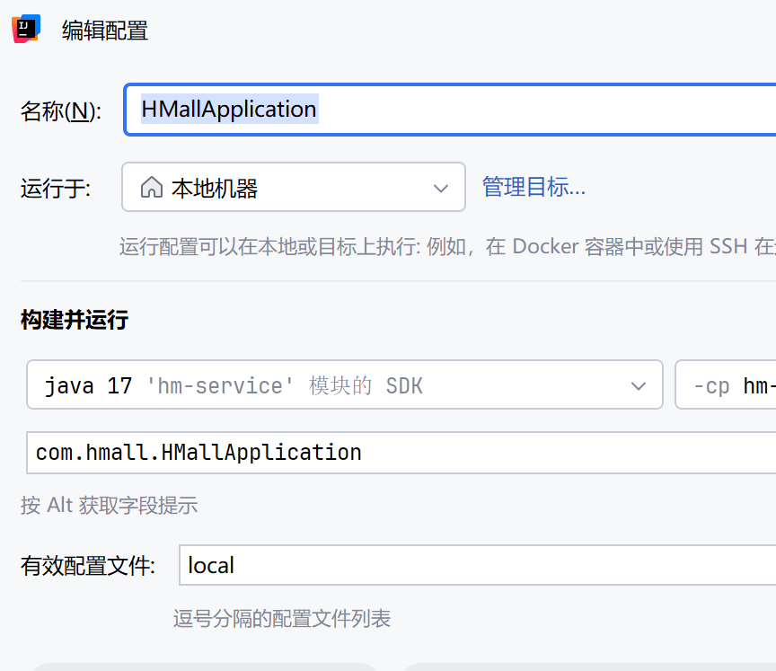 在Docker中我们已经部署了hmall项目,项目资源默认是用dev中的Mysql的配置,所以我们在上一篇文章Docker就能成功运行,但是我们想让他改成本地的local就要如下步骤