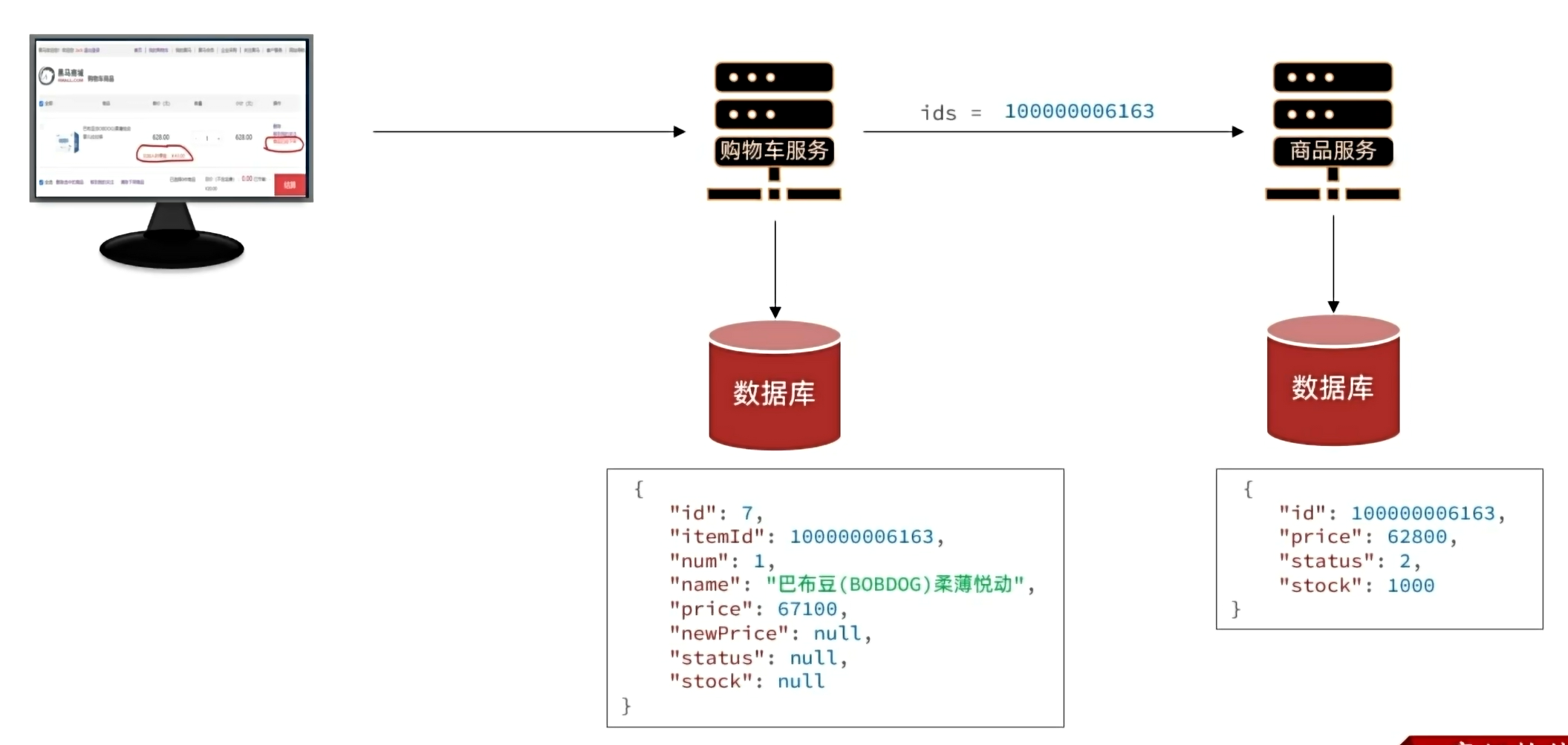 解决:物理上两者是隔绝的,但是从网络上两者又是相通的,因为这两者之后部署到服务器上也好,部署到容器当中也好,都是可以通过网络连接的。所以可以通过网络请求数据。购物车微服务通过网络向商品微服务发起请求: